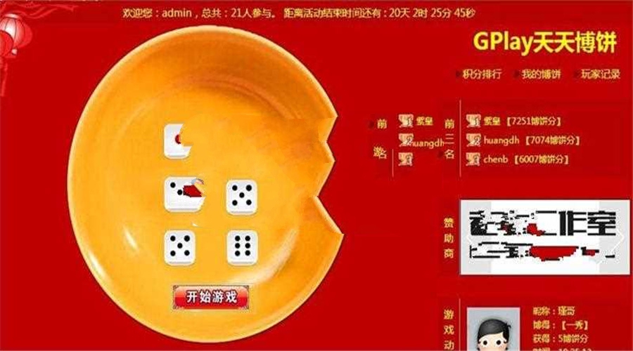 GPlay天天博饼是一款简单的娱乐游戏。可以独立开展活动玩法,完全自定义展示风格等。摇动6粒骰子,摇中相应的奖项可获得相应的博饼分和任意设置的论坛积分。
