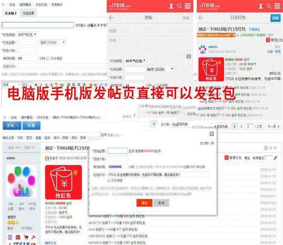 it618帖子口令红包同时支持电脑版与手机版帖子,可以设置积分类型,红包最低单价,红包最小总金额,红包最大总金额,版块权限,发红包用户组权限与抢红包用户组权限,对帖子有推广作用,对论坛有增加人气作用。