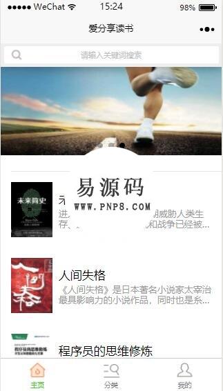 • 微信小程序爱分享读书分类资讯阅读demo完整源码下载