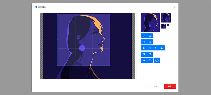jQuery头像图片裁剪尺寸插件,点击“裁剪图片”按钮弹出裁剪功能窗口,支持移动图像、裁剪图片、放大缩小、上下左右移动、翻转、重置等功能。