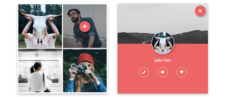 这是一款精美的jQuery+CSS3交互式头像图片网格布局代码,点击头像图片动画切换到个人信息展示界面。