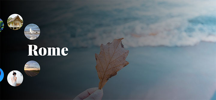 一款大气的jQuery+html5圆形缩略图导航全屏图片切换特效,点击缩略图旋转并切换至对应大图,缩略图也变成文字标题。
