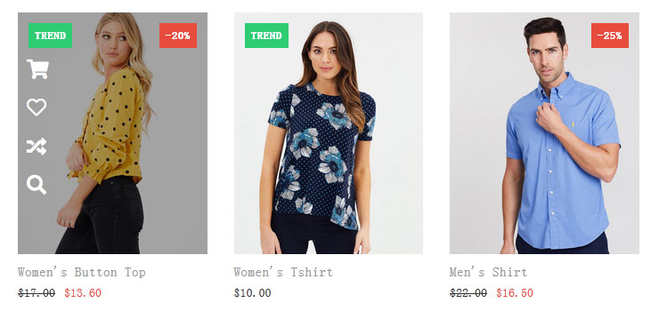 CSS3响应式鼠标悬停商品图片切换动画特效是一款bootstrap框架制作的商城商品列表布局效果,当鼠标经过商品卡片区域时遮罩显示功能图标并切换商品图片。