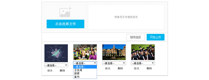 一款支持图片预览,图片放大查看,删除,选择类别,拖拽上传等功能的图片批量上传插件,功能强大的jQuery图片上传代码。